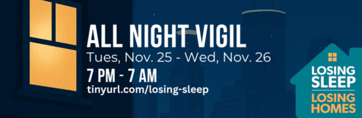 If you care about home, you are invited to participate in the Losing Sleep, Losing Homes Vigil starting Tuesday, November 25. Participants can join the vigil in person or virtually by committing to one or more one-hour shifts to stay awake, contact your member of Congress, and hold vigil. Those who are able are especially encouraged to come in person for the opening and closing hours to help create a strong, visible presence.